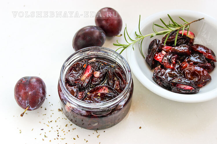 Хлопья чили и один зубчик рубленого чеснока прокалите в растительном масле (это можно сделать и в микроволновке). Используйте обычное растительное масло без яркого аромата. В стерилизованную банку укладывайте вяленые сливы, заливайте маслом и добавьте немного сушеных трав.
