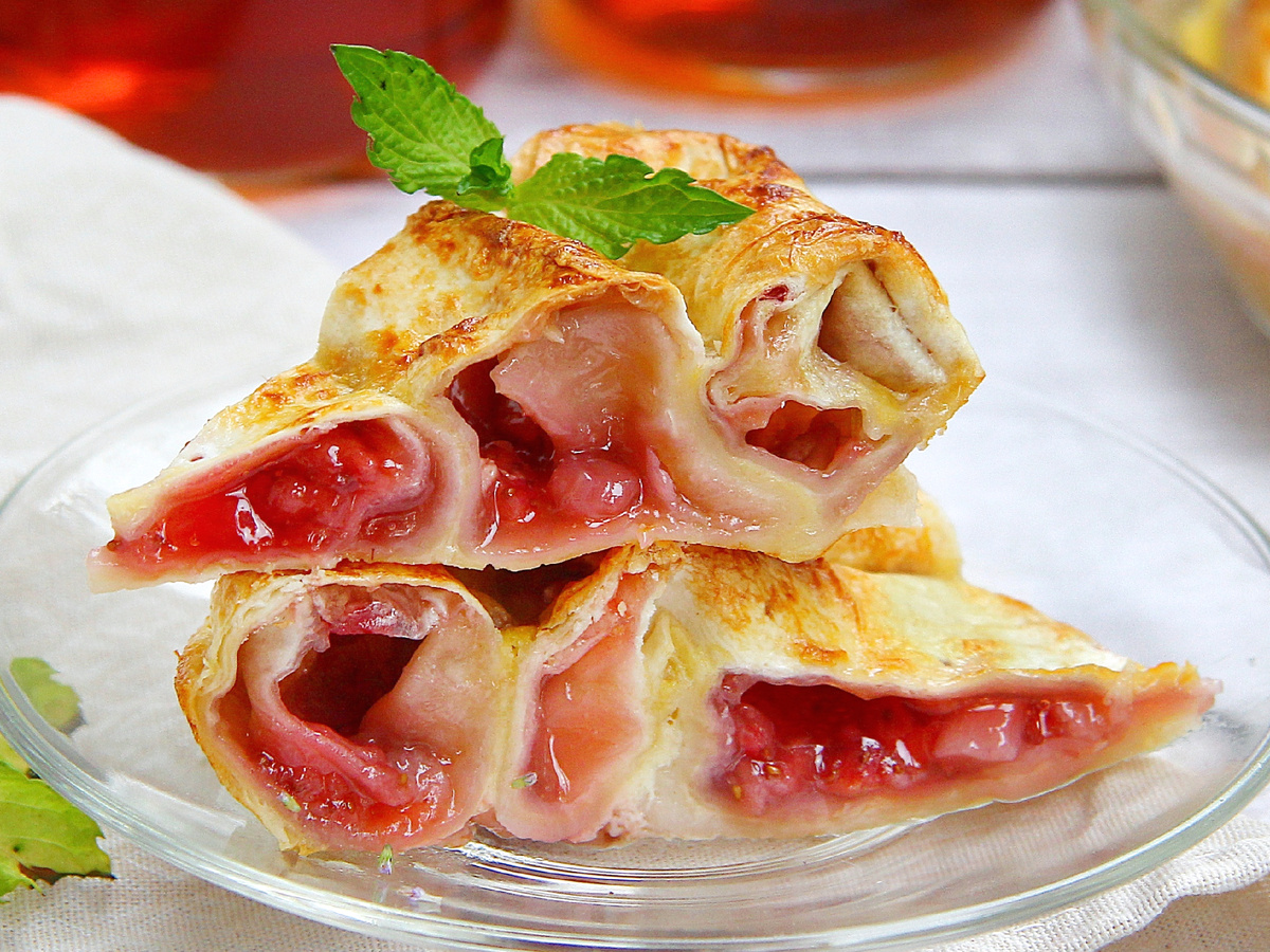 Для начала подготовьте начинку. Клубнику следует нарезать кубиками и засыпать в сковороду, добавив сахар. Тушите ягоды 2-3 минуты, чтобы сахар растворился, но ягоды не превратились в кашу. Далее следует приготовить крахмальную смесь, добавив крахмал в воду и, перемешав, влить в клубнику. Готовьте до загустения.