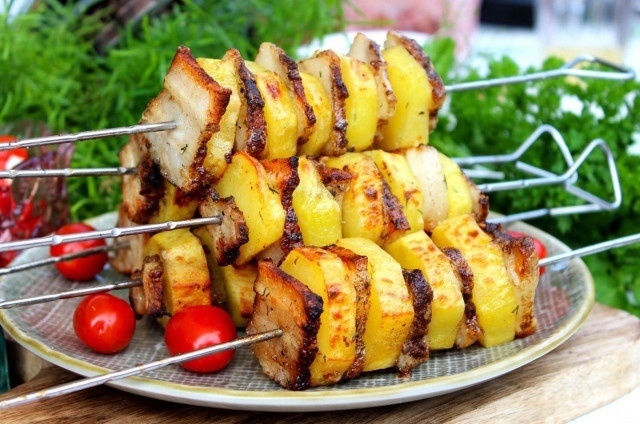 Теперь картошку и сало можно нанизать на шампуры: чередуйте между собой картофельные кружочки и кусочки сала. Заверните шампуры в фольгу, чтобы ароматы не убегали, и направляйте их на заранее разожжённый мангал. Когда угли прогорят, шампуры можно укладывать на решётку. Время приготовления составляет около 30 минут, при этом не забывайте переворачивать их для равномерного прогрева.