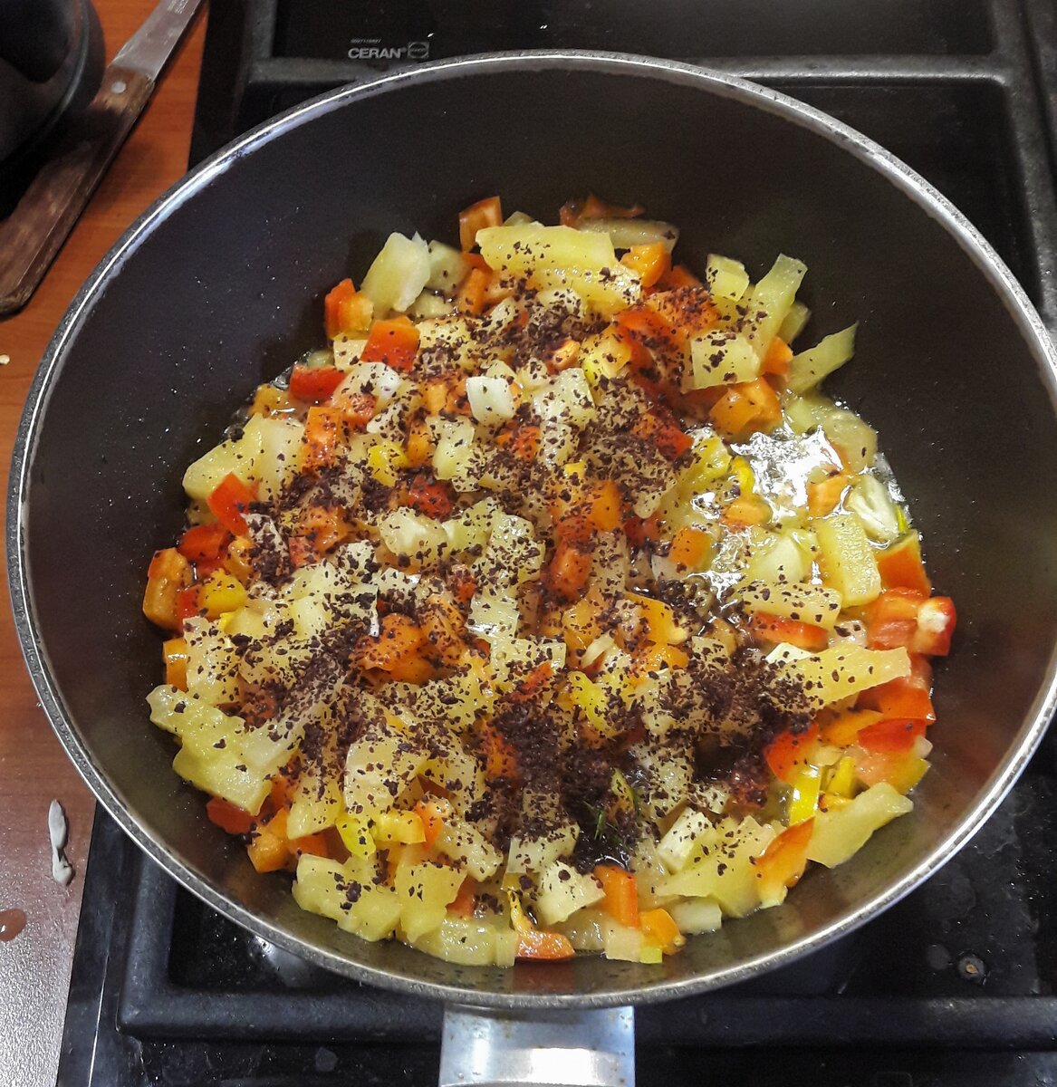 В сковороде разогревается растительное масло с семенами кориандра. Когда масло хорошо нагреется, добавляются нарезанные перцы и ананасы, засыпанные сумахом. Блюдо стоит слегка обжаривать, постоянно помешивая.