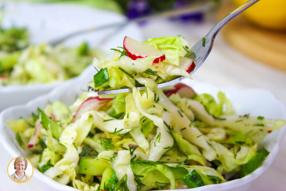 Салат из молодой капусты с огурцом и редисом готов! Наслаждайтесь свежестью блюда и приятного аппетита!