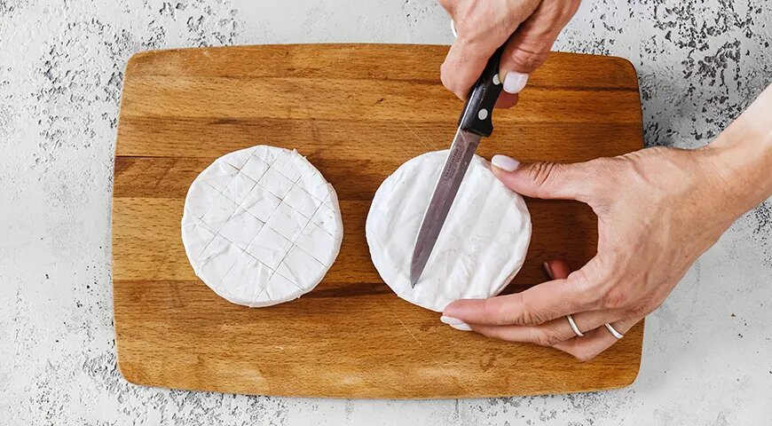 Начните с того, чтобы достать камамбер из упаковки и сделать на его поверхности несколько надрезов в виде решётки. Это позволит ему лучше расплавиться и насытить ароматом.