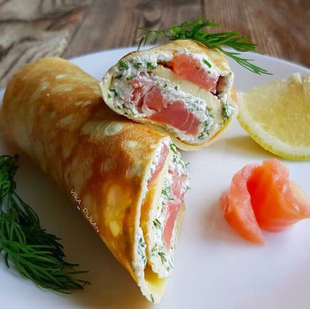 На охлажденный блинчик равномерно распределить творожную массу, сверху положить кусочки рыбы и аккуратно завернуть рулетик.