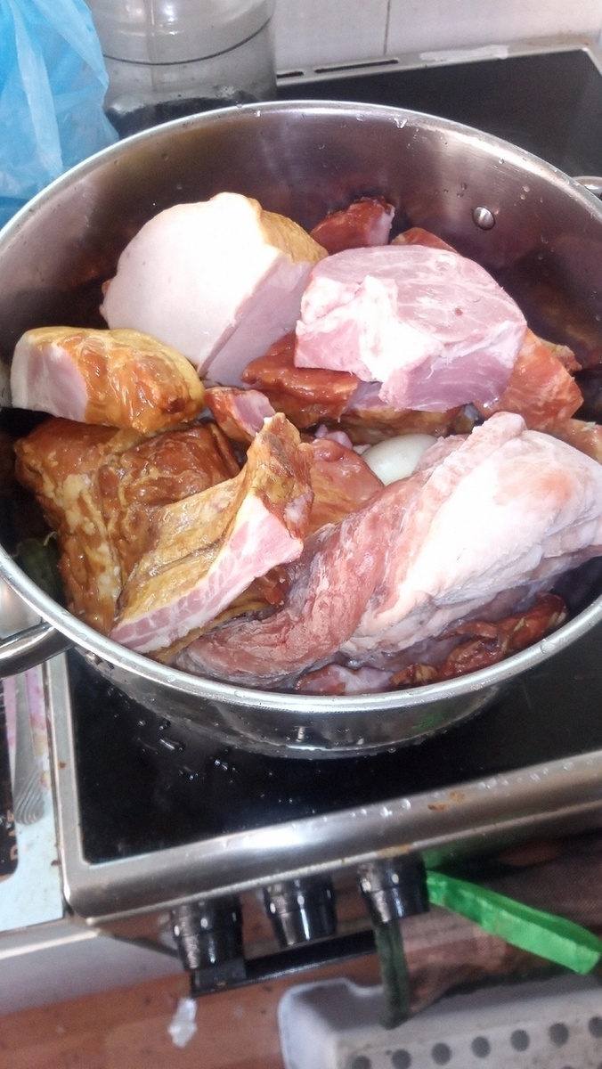 Первоначально вся мясная основа, за исключением колбас и ребрышек, помещается в кастрюлю с водой и одной очищенной луковицей. Варить на медленном огне при 150 градусах в течение двух часов, периодически удаляя пену. После этого луковицу извлекают, а бульон оставляют.