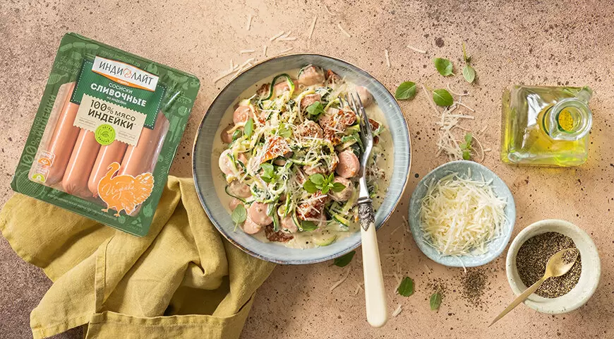 Сегодняшний рецепт ломает привычные стереотипы о пасте. Вместо традиционного теста — свежие цукини, а вместо мясных колбасы — сосиски из индейки. Результат вас приятно удивит!