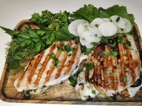 - Внутрь каждого кармашка добавить обжаренные грибы с луком, порезанную на четвертинки моцареллу и свежую зелень. Закрыть кармашек другой половиной филе.