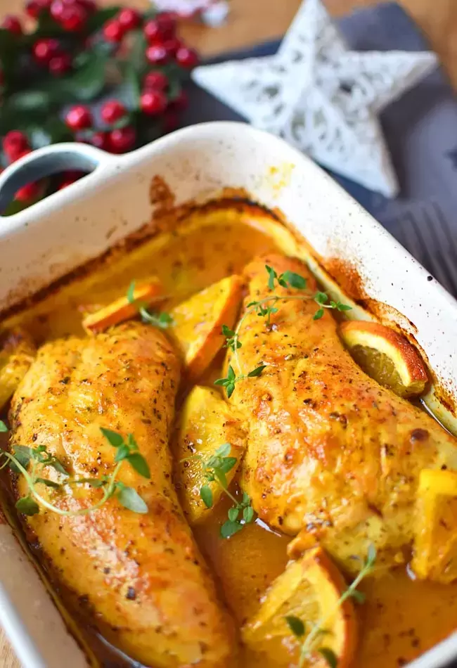 Разогрейте духовку до 180°C. Апельсины нарежьте на четвертинки и добавьте к индейке. Выложите куски в форму для запекания, полейте оставшимся маринадом и разместите дольки цитруса сверху.