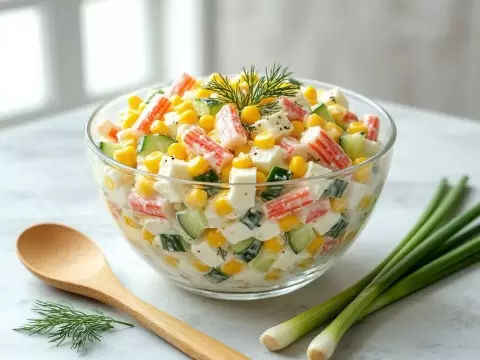 Когда хочется чего-то легкого и быстрого, но классические блюда выглядят излишне тяжеловесными, на помощь приходит "Крабовый салат без риса". Этот свежий вариант получается гораздо более воздушным, чем привычный, и готовится всего за несколько минут. Он идеально подойдет для тех, кто хочет сэкономить время в ожидании гостей, а также станет легким решением для ужина. Отсутствие риса делает салат менее калорийным и даёт ему хрустящую текстуру, что особенно понравится приверженцам здорового питания.