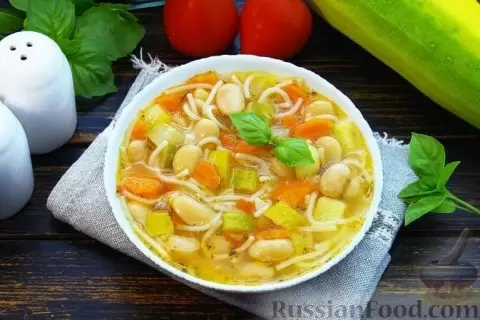 Овощной суп с фасолью и вермишелью станет отличным вариантов первого блюда, даже без мяса. Разнообразие бобовых и овощей создает насыщенный вкус. Итальянские травы окажут влияние на аромат, делая суп еще более аппетитным.