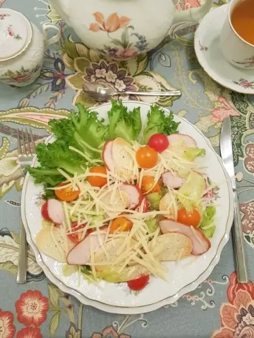 Салат айсберг нарезаем полосками и смешиваем с заправкой. На тарелки выкладываем листья салата, сверху разбросаем курицу, сухарики и пополам разрезанные помидоры черри. Всё это посыпаем натертым сыром и подаем на стол. Такой салат станет настоящей звездой любого обеда или ужина, радуя своим вкусом и внешним видом.