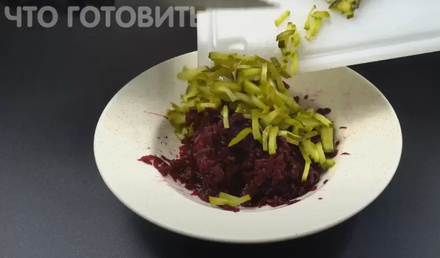 Для начала стоит отварить свеклу до мягкости, а затем натереть ее на крупной терке. Далее маринованные огурцы следует нарезать тонкими пластами, а потом мелко измельчить ножом.