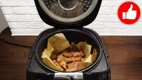 Чтобы курица получилась особенно нежной, на дно чаши мультиварки рекомендуется постелить бумагу для выпечки, приподняв края. Выложите куриное филе в беконе на бумагу и полейте оставшимся маринадом. Теперь курочка готова к готовке: выберите режим «мультиповар» при температуре 130 градусов и установите время приготовления на 30 минут.