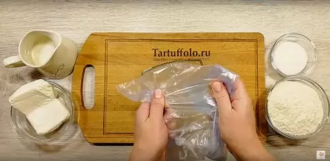 В пакет помещается 180 г творога и два яйца. Чтобы добиться необходимой сладости, добавляют 2 столовые ложки сахара, и для аромата — чайную ложку ванильного сахара. Затем вводится 120 мл молока и 150 г муки. После наполнения пакета, необходимо убрать воздух и плотно завязать его на узел.