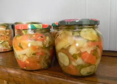 За три минуты до завершения стерилизации необходимо добавить уксус в каждую банку. После этого банки закручиваются, переворачиваются и укутываются до полного остывания. В итоге, на стол подается ароматный донской салат, который прекрасно дополняет любое зимнее блюдо.
