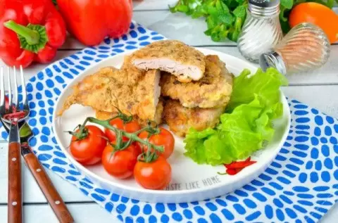 Подача: Готовые отбивные выкладывают на бумажное полотенце для удаления лишнего жира. Подать горячими с картошкой, овощами или свежим салатом.