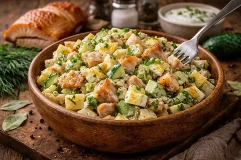 Салат с горячим копчением станет отличным решением для быстрого и вкусного ужина. Он удобен, сытен и со временем только улучшается: рыба прекрасно «дружит» с заправкой, а картофель получает дополнительные ароматы, становясь ещё более вкусным на следующий день.