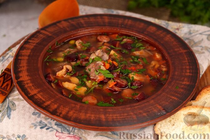 - Говяжий суп с охотничьими колбасками и грибами. Этот суп обладает насыщенным вкусом благодаря говяжьему бульону и ароматным ингредиентам, таким как сладкий перец и вёшенки. Добавление консервированного горошка придаёт блюду лёгкость.