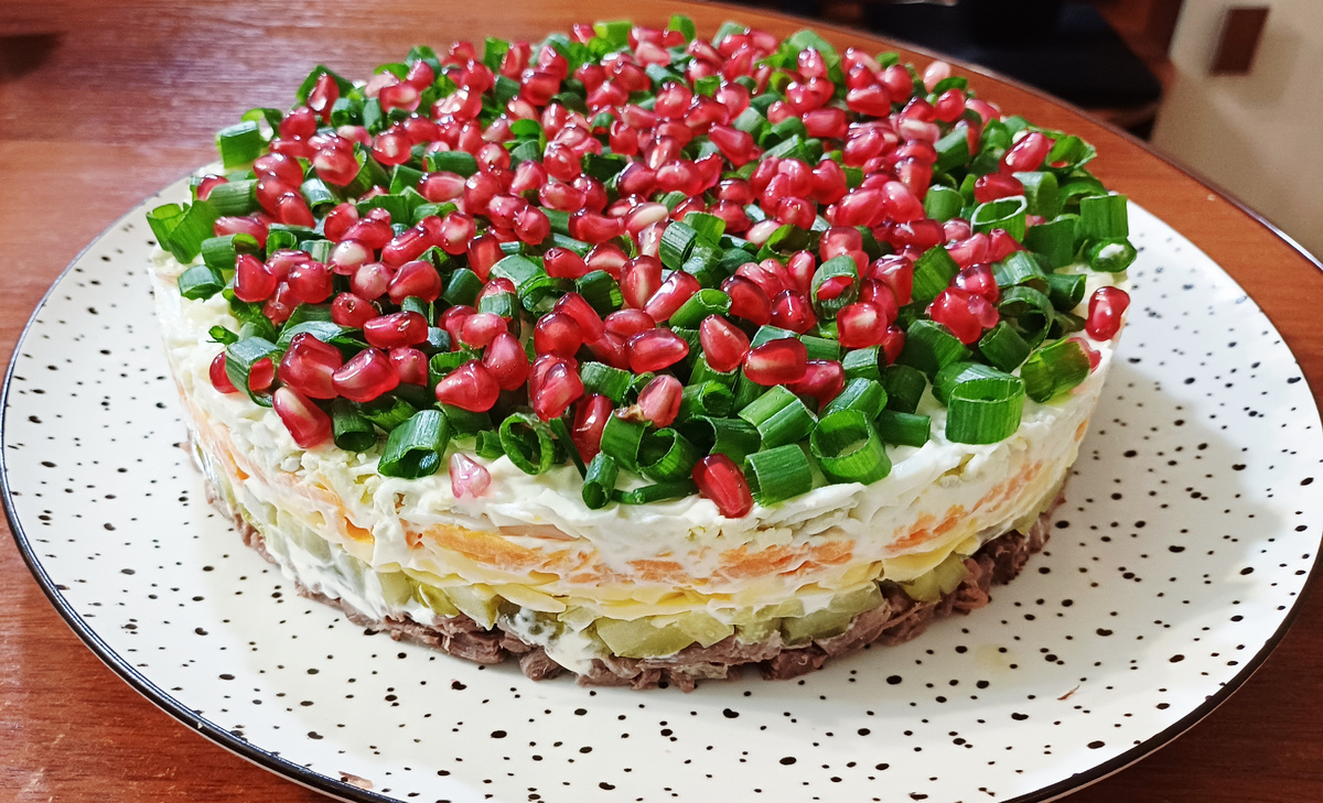 Подача этого салата может варьироваться в зависимости от случая. Если он украшен зернами граната и зелёным луком, то получится поистине как произведение искусства. Убрав колечко, в котором собирался салат, вы сможете продемонстрировать яркие слои и текстуры.