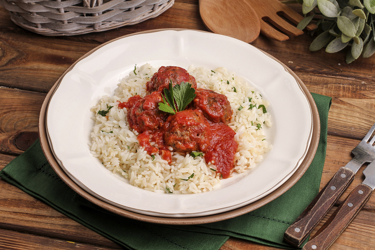 Пока тефтели готовятся, промывайте рис жасмин в большом количестве воды в кастрюле, кипятите 1,5 л воды, добавляя соль. Кипящий рис готовьте 10-12 минут, после чего откиньте на дуршлаг и промойте. Мелко нарезанную петрушку добавьте в рис и подавайте вместе с тефтели.