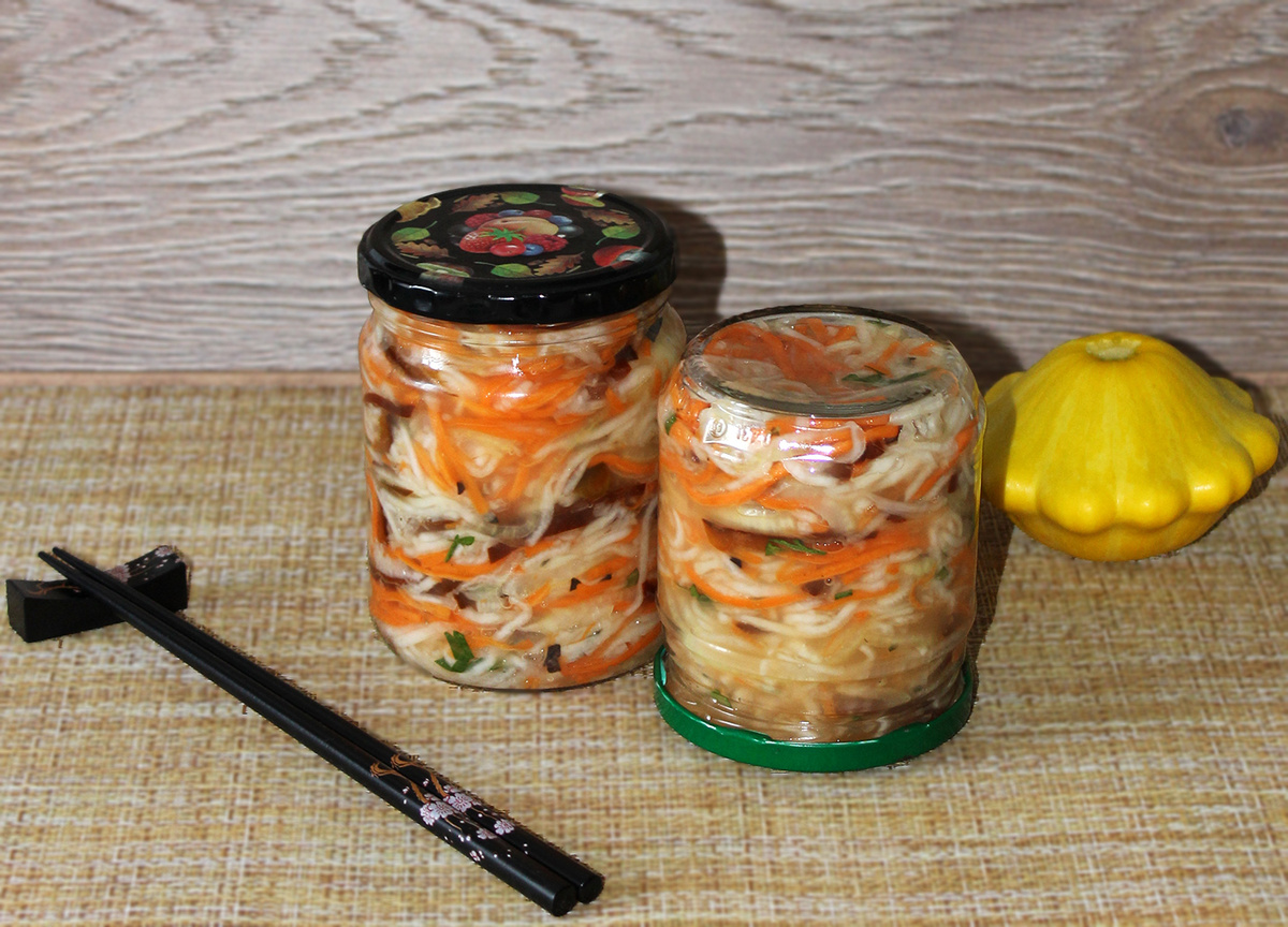 Начинаем с очищения патиссонов от кожицы и семян. Морковь моем и очищаем, после чего натираем на крупной терке. Для удобства можете использовать терку для корейской моркови.