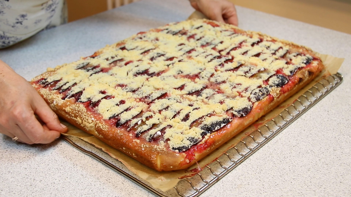 Когда основа поднялась, пора готовить намазку: просто смешайте все ингредиенты до однородности и равномерно распределите по тесту. Затем выложите подготовленные сливы и посыпьте сверху крошкой.