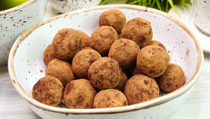 4. Колобки обваливают в какао-порошке и помещают в холодильник для охлаждения. Лучше всего подавать эти конфеты с травяным чаем из листьев малины, смородины и иван-чая, который необходимо настоять около 10 минут перед подачей.