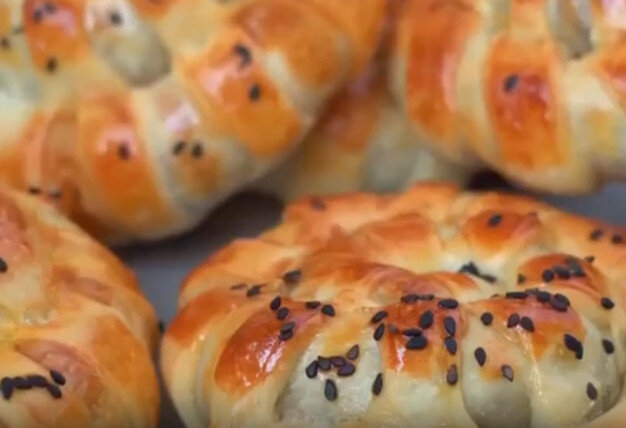 Выложите полученные булочки на противень, смажьте желтком и посыпьте кунжутом. Выпекайте при температуре 200°C в течение 20 минут до золотистой корочки.