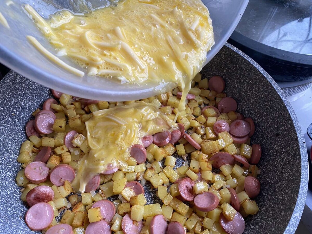 6. Залейте картошку с сосисками яично-сырной смесью, уменьшите огонь до минимума и накройте крышкой.