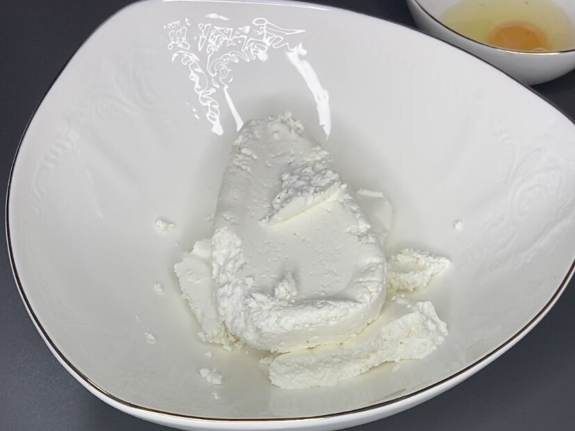 1. В глубокой миске смешивают творог, яйцо, щепотку соли и ложку сахара, тщательно перемешивают.