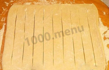Сначала слоеное тесто необходимо разморозить и раскатать в прямоугольник со средней толщиной. С помощью острого ножа сделать неглубокие надрезы, оставляя по сантиметру от краев, чтобы получилась своеобразная «решётка».