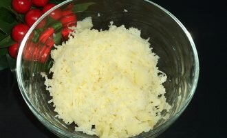 1. Приготовьте картофель в мундире в подсоленной воде. Дайте ему остыть, затем очистите и натрите на мелкой терке.