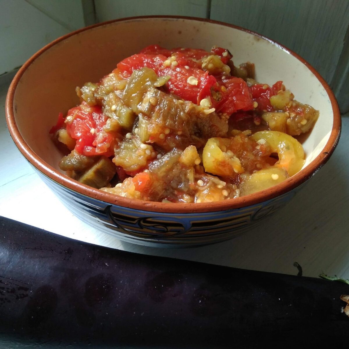 После того как овощи подрумянятся, их снимайте с шампуров и дайте немного остыть, чтобы можно было удобно очистить от кожицы. Для этого лучше использовать перчатки, а у перцев и баклажанов удалите плодоножки. После очистки нарежьте их крупными кусками, а помидоры оставьте целыми.