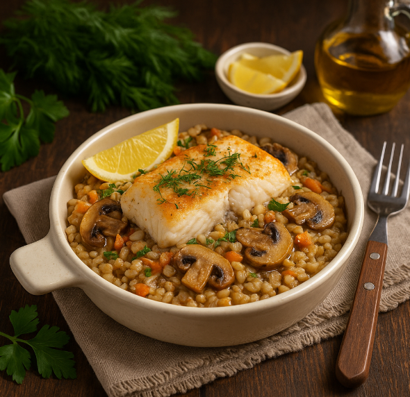 Перловка здесь не просто дополнение, а полноценная основа, впитывающая в себя все соки и ароматы. Рыба придаёт блюду нежность, а грибы добавляют богатый вкус. Всё готовится в одной сковороде, благодаря чему сокращается время на мытьё посуды.