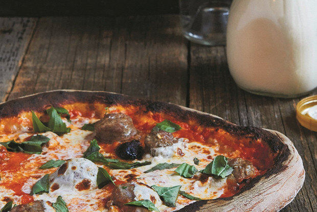 Приготовить томатный соус: в блендере соединить оливковое масло, чеснок, орегано и хлопья перца. Добавить помидоры и быстро перемешать до однородной массы.Для водочного соуса выпарить водку в сотейнике, затем добавить сливки и готовить на медленном огне, периодически помешивая.Смешать оба соуса, довести до кипения и снять с огня для остывания.Сборка и выпечка пиццы