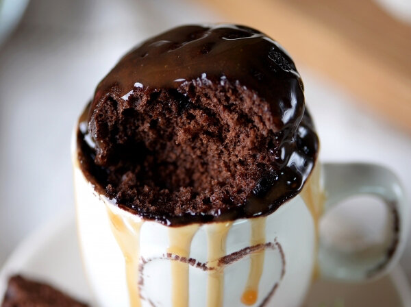 Смешать сухие ингредиенты, затем отдельно соединить жидкие. Объединить обе смеси, тщательно перемешать до однородной консистенции. Наполнить кружки тестом до половины и готовить в микроволновке в течение 2 минут.