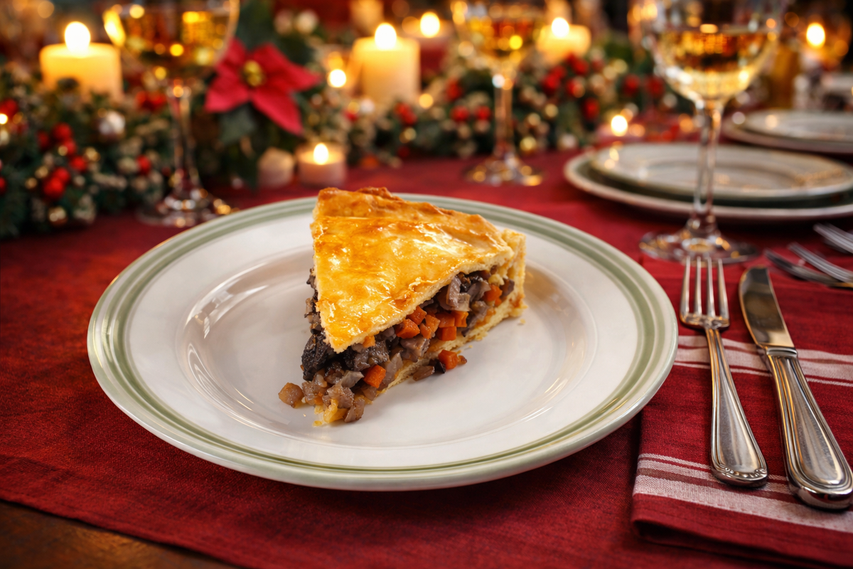 Для создания теста в блендере смешать холодное сливочное масло (150 г), муку и щепотку соли до состояния мокрого песка. Затем влить холодную воду и еще раз перемешать, чтобы тесто собралось в комок.Сформировать из теста шар, завернуть его в пленку и убрать в холодильник. Разогреть духовой шкаф до 200 градусов в режиме конвекции. Лук и морковь нарезать кубиками размером около 1 см.Запеченную говядину также нарезать кубиком. Грибы оставить целыми или нарезать, если они слишком крупные.На сковороде разогреть растительное и сливочное масло, обжарить лук с морковью до прозрачности. Добавить мясо и грибы, влить вино и уваривать до уменьшения объема вдвое. По вкусу приправить солью, перцем и сахаром для смягчения кислоты вина. Снять с огня.Отделить треть теста и раскатать оставшуюся часть между двумя листами пергамента, чтобы не прилипало. Вторую часть раскатать так же. Большую часть теста выложить в форму для выпечки, наколоть вилкой и выпечь 15 минут.Готовое тесто заполнить мясной начинкой и накрыть меньшим пластом теста. Для золотистой корочки можно смазать взбитым желтком, молоком или сливками. Делать отверстия для выхода пара и выпекать пирог еще 15-20 минут. Пирог подавать теплым или охлажденным.