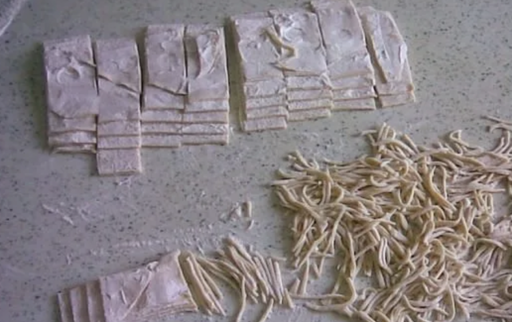 Смешать все компоненты (кроме масла) в большой ёмкости и замесить тесто. Оформить его в шар, поместить в смазанную растительным маслом ёмкость и накрыть пленкой. Оставить на час при комнатной температуре. Затем разделить тесто на две части и раскатать в тонкие лепёшки. Нарезать одну на длинные полоски для лапши, а другую — на небольшие квадратики. Обжарить квадратики на сковороде до золотистой корочки.