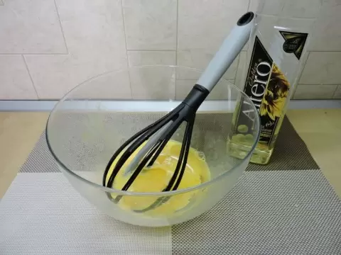 1. Для начала взбиваются яйца с растительным маслом. Следом добавляется сахар, и смесь снова хорошо перемешивается — это можно сделать венчиком или вилкой.