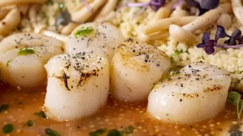 Сковороду разогреть с растительным и сливочным маслом, добавить раздавленный чеснок. Выложить гребешки и обжарить их по 30–40 секунд с каждой стороны, затем переложить на тарелку. В ту же сковороду влить белое вино, добавив сахар для балансировки кислоты. Выпарить алкоголь и добавить мелкие грибы, обжарить в течение трех минут.