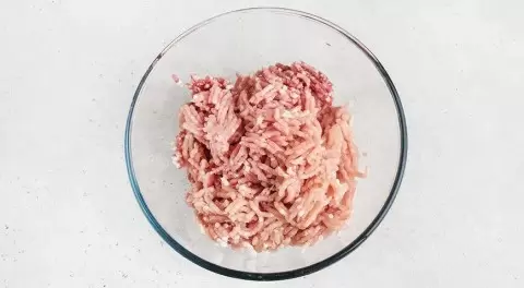 Начинается всё с подготовки фарша. Первым делом куриное филе и свинину, желательно с небольшим содержанием жира, нарезают на мелкие кусочки. Затем мясо можно пропустить через мясорубку или перебить в блендере до однородной массы.