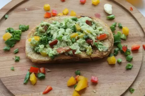 - Брускетта с авокадо: Ломтики обжаренного хлеба, намазанные смесью авокадо и болгарского перца, прекрасно откроют ужин.