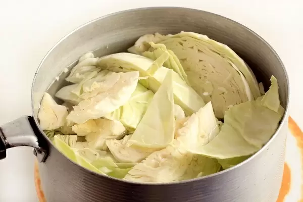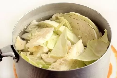 2. Нарежьте капусту крупными частями и отварите в подсоленной воде в течение 15-20 минут до мягкости. После этого слейте воду и остудите капусту, тщательно отжав излишки влаги.