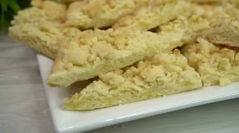 Сформировать из теста прямоугольник на противне и сверху посыпать приготовленной крошкой. Выпекать в предварительно разогретой до 200 градусов духовке в течение 15-20 минут — время выпекания может варьироваться в зависимости от особенностей вашей духовки. Как только печенье будет готово, его нужно достать, подождать немного остывания, а затем нарезать на кусочки и сервировать к чаю.