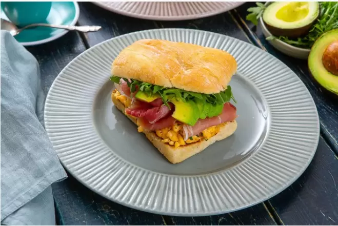 Шаг 6: Рукколу нарвать крупными кусками. На нижние половины чиабатты выложить омлет, затем ломтики авокадо, окорок и рукколу, после чего накрыть верхней половинкой.