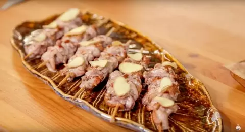 Готовые шашлычки выкладываются на тарелку, сверху добавьте нарезанный имбирь и полейте вытопленным жиром, предварительно доведенным до кипения. Этот финальный штрих наполнит блюдо гармонией и ароматом.