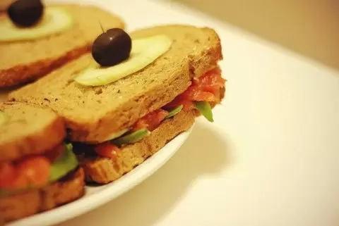 Очистить авокадо и нарезать его тонкими ломтиками. Огурец также нарезать тонкими кругами.В небольшой миске соединить майонез, лимонный сок и немного черного перца.Сборка сэндвичей