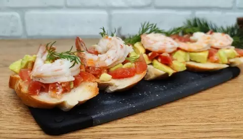 На подготовленные ломтики багета положите овощную смесь, сверху аккуратно выложите обжаренные креветки и украсьте укропом. Вот и готова эффектная и вкусная закуска!