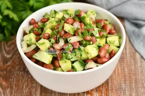 Этот салат сочетает нежность фасоли, хрустящие огурцы и ароматную заправку. Вариант с помидорами также отлично подойдет для замены огурцов. Помидоры следует разрезать, удалить семена и сок — так салат получится менее жидким, но не менее вкусным.