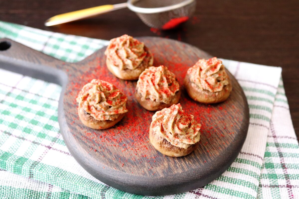 Получившимся чечевичным пюре наполнить кулинарный шприц и аккуратно выдавить на запеченные шляпки шампиньонов. При подаче посыпать паприкой для яркости и завершенности блюда.