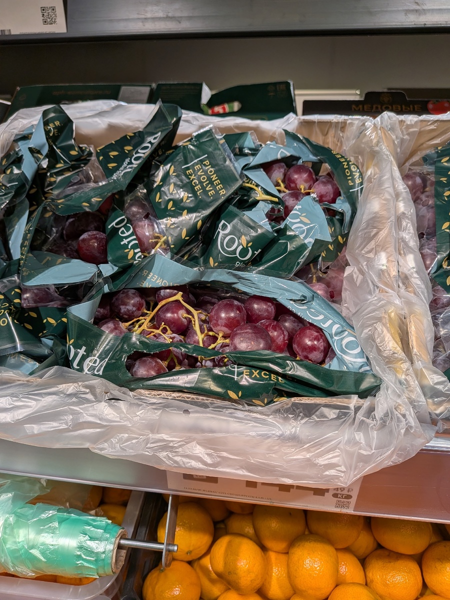 С началом сезона свежих фруктов на полках появились нектарины и виноград. Виноград, наконец, радует глаз: крупные, блестящие ягоды рассказывают о прибыли, но цена в 409 рублей за килограмм делает его довольно дорогим удовольствием. Нектарины тоже не спешат радовать качеством — стоят 299 рублей и выглядят привлекательно, но при выборе возникает сомнение в их вкусовых качествах.